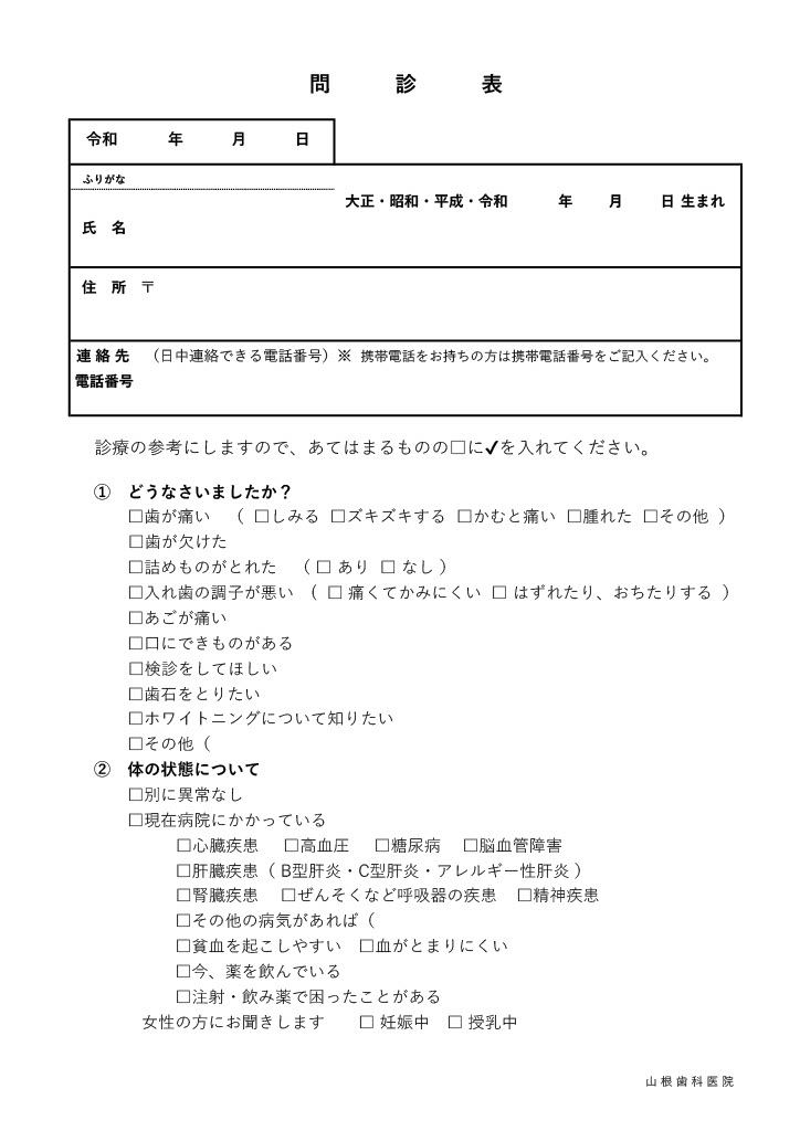 こちらの問診票に事前に記入していただき、ご来院時に受付へ提出していただけますと、診療までの流れがスムーズに進み、待ち時間の短縮につながりますのでご協力お願いいたします。